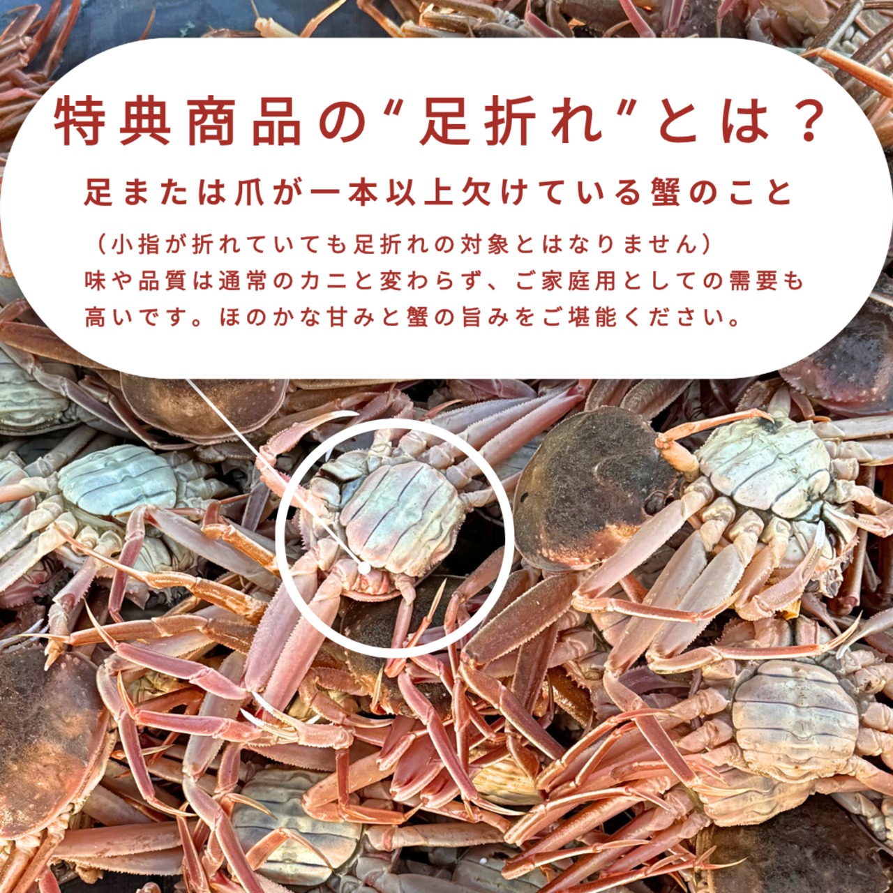 漁の際に足が1〜2本折れてしまっただけで、味や品質は一切変わらないお得なカニです。(小指が欠けている場合は足折れ対象外です。)