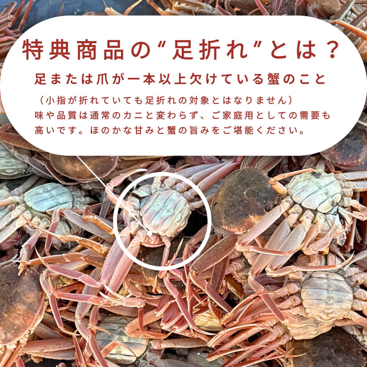 漁の際に足が1〜2本折れてしまっただけで、味や品質は一切変わらないお得なカニです。(小指が欠けている場合は足折れ対象外です。)